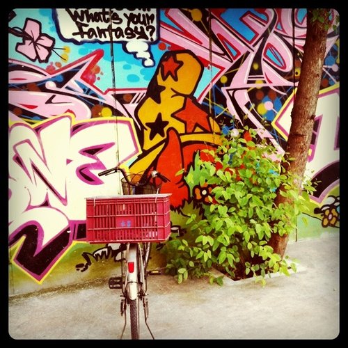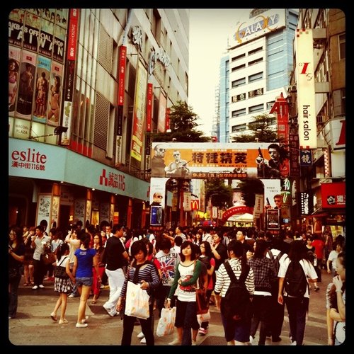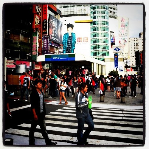 今天我計畫的順序是先到西門紅樓繞一下,不只是創意市集、建築,從那裡回過頭拍中華路口的方向也很不錯。之後就由誠品166那裡進西門町,到Bodyshop 拐彎進巷子繞一下小巷擁擠的市集,再經過峨眉停車場往電影公園。在那裡還可以拍塗鴉與玩滑板的青少年。在那裡的也門町咖啡館稍事休息之後,再從電影街轉潮店林立的美國街,再慢慢的回到捷運六號出口,就差不多可以結束了。